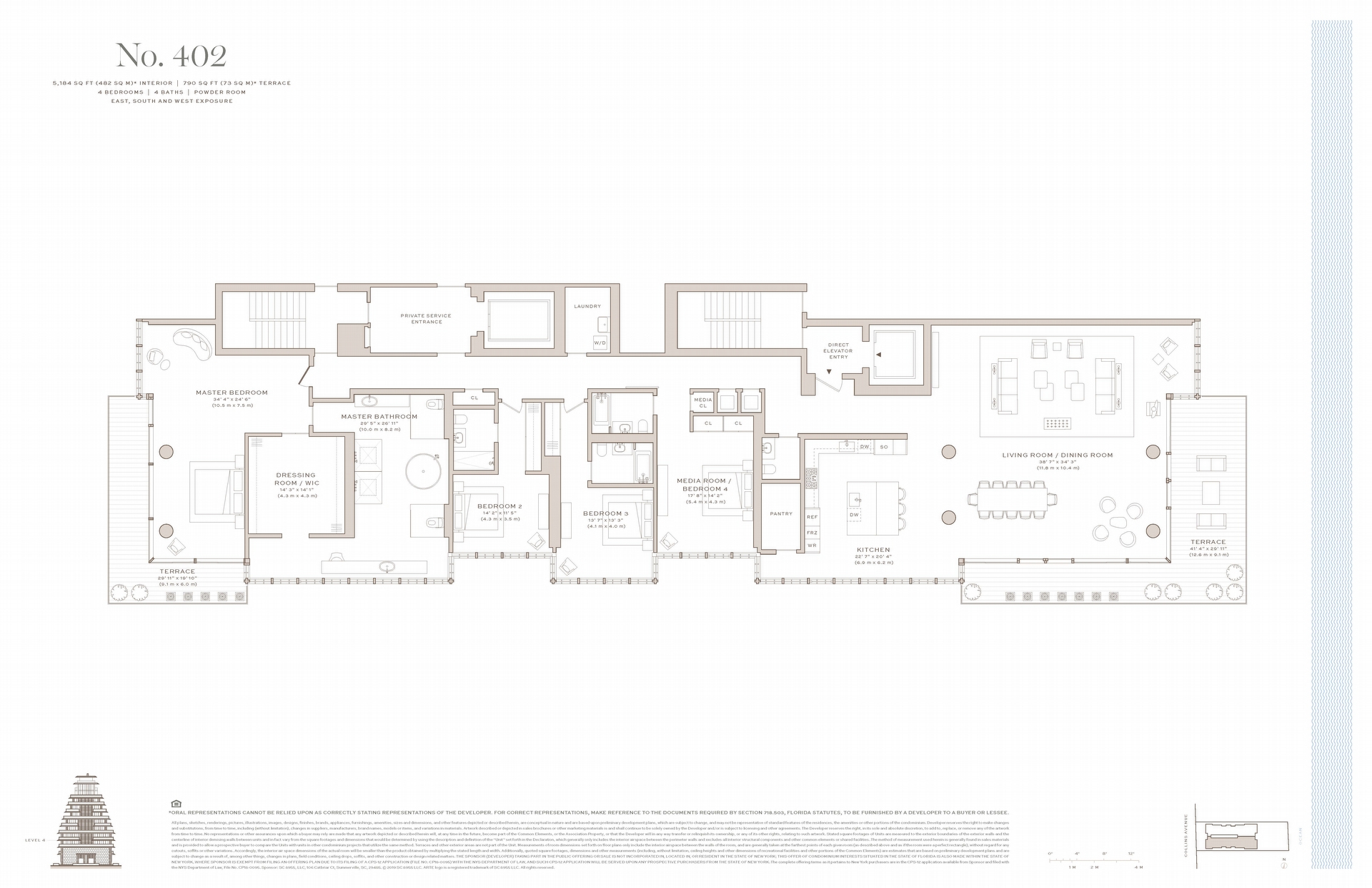 Residence features include direct elevator entry with fingerprint recognition technology, floor to ceiling bronze Schuco gridded insulated and laminated glass wall system. Wraparound terraces with Roman travertine ceilings and Brazilian Ipe decks, and expansive living, dining and entertaining area with Roman travertine accent wall and linear cove lighting. Flooring is luxurious 11” wide 10-foot long Italian White Oak with brushed pearl finish.